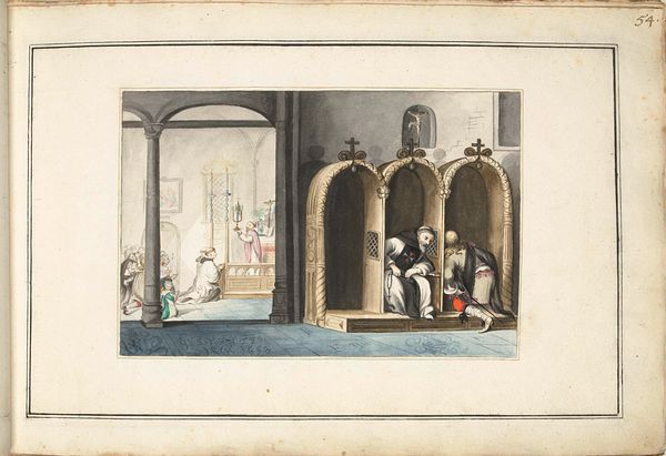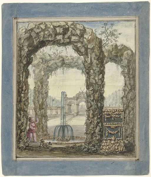 Editor: This is "Het Groene Koningins Kabinet," or "The Green Queen's Cabinet," a print by Carel Allard, dating from 1660 to 1693. I’m struck by how it depicts cultivated nature as a stage, almost theatrical. What do you make of it? Curator: I see a celebration of power interwoven with the symbolic language of gardens. Note how the architectural framework—the trellis—doesn’t just contain nature; it *shapes* it. The figures within become part of this controlled, almost performative landscape. Editor: Performative in what way? Curator: Think of gardens in the Baroque period: they were spaces for displays of wealth and status. This print captures that perfectly. What about the color, particularly the dominance of green, what does it suggest to you? Editor: Well, the title emphasizes it…maybe abundance or fertility? Perhaps even a sense of idealized nature, far removed from wilderness? Curator: Precisely. The garden is a symbol of order and control over the natural world, which, in turn, reflects the Queen’s power. But do you see anything… slightly unsettling about that level of control? The rigidity? Editor: Now that you mention it, the perfectly symmetrical design feels a bit artificial. Almost too perfect to be natural. It is interesting how the Baroque leaned into order to represent stability. Curator: And in doing so, created a fascinating tension between the real and the ideal, the wild and the tamed, a concept that resonates through history.