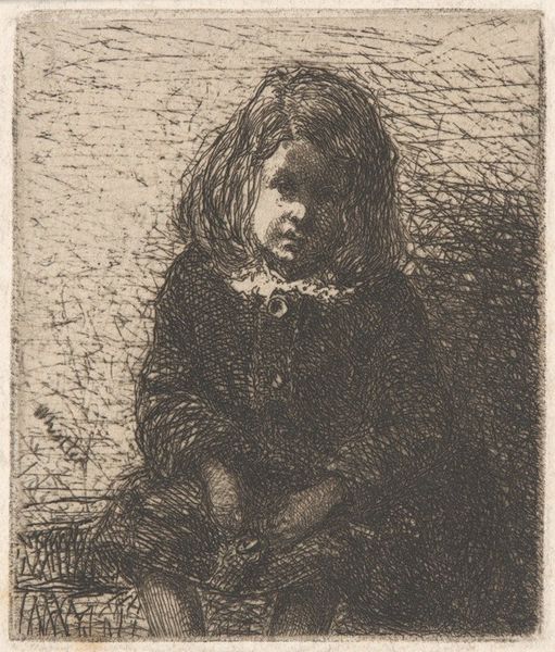 Curator: Eastman Johnson's work, titled "The Freedom Ring," completed around 1860, is a powerful piece executed in oil on canvas. Editor: Immediately, what strikes me is this contrast between the almost oppressive darkness of the background and that bright vermillion coat. It's like a flame in the shadows, demanding attention. Curator: Indeed. The color interplay serves to accentuate the subject – the young girl and her thoughtful regard of the ring. Structurally, the painting relies heavily on chiaroscuro, typical of the Realist movement, with subtle details rendered to bring her figure into focus. The backdrop, suggestive and muted, almost recedes from direct apprehension. Editor: I find her gaze so compelling! She holds this simple ring as though it's whispering secrets. What secrets, I wonder? Could it be the ring of an enslaved relative purchased to freedom, or perhaps a memento representing future emancipation? It gives me the chills just to think about it. There's a potent narrative bubbling beneath the surface here. Curator: This evocative mood links "The Freedom Ring" with the larger genre painting context of its period, mirroring themes prevalent in Johnson's work which are social reflection and individual psychology. There is an almost unsettling intimacy here; a potent communication with private emotion via restrained technique. Editor: I see your points about restraint. Still, to me the entire piece vibrates with an underlying anxiety—all these contained yearnings, you know? The color is daring; that flash of bright scarlet hinting that maybe liberation, like her coat, doesn’t quite fit just yet but suggests a radiant dawn is at hand. That darkness can't extinguish it completely. Curator: The subtle tensions certainly add an unexpected dimension to a simple portrait genre painting, giving it socio-historical gravity far greater than its size implies. Editor: Absolutely. It really gets under your skin, doesn’t it? Not something one forgets so readily after viewing. Curator: Indeed, its persistent resonance perhaps forms the greatest index of its success.