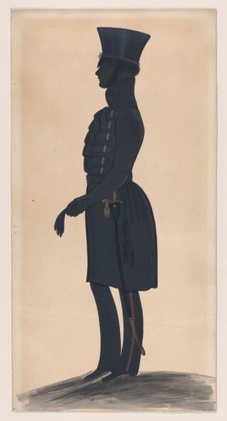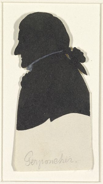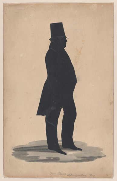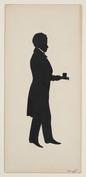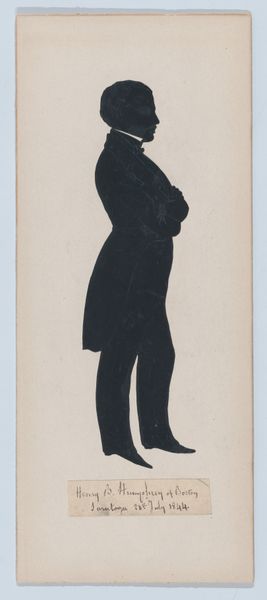 Editor: This diminutive portrait of John Quincy Adams projects an outsized gravity, don't you think? The rigid black figure centered on mottled paper gives a rather severe impression. Curator: Indeed. It's a silhouette attributed to William Henry Brown, created sometime between 1828 and 1843. Notice how Brown has simplified the figure into stark shapes, distilling the essence of the subject's form. Editor: Precisely. That strong profile immediately conveys purpose. But the caricature adds something. Even though it's just a shadow, the carefully placed detail of his hair hints at a softer personality beneath. Curator: Agreed. Silhouette portraits such as this were relatively inexpensive ways of capturing one’s likeness in the early 19th century. By tracing the shadow cast by the sitter, the artist was able to reproduce precise outlines and proportions, allowing for quick duplication and distribution. Observe the neat edges against the rough background—this intentional play provides both delineation and contrast. Editor: Right, and consider what Adams symbolized as a president and intellectual at a transitional time in American history. The choice to depict him as a flattened black shape hints at themes of concealment, perhaps alluding to the shadows of political life. A very literal rendering of 'the shadow of a man'. Curator: You present an insightful analysis of potential symbolic resonance. What fascinates me is the stark presentation within the two-dimensional picture plane, achieved through minimalist gesture, as if reducing Adams to his very foundation. The tonal qualities produced by the paper support his imposing figure and amplify our focus on its simplified form. Editor: Ultimately, this deceptively simple work presents not just a likeness, but a powerful cultural shorthand for statesmanship, integrity, and perhaps even the burden of history itself. Curator: Yes. And through his subtle manipulation of shape, line and contrast, Brown transcends mere likeness to generate powerful symbolic value that still speaks across time.