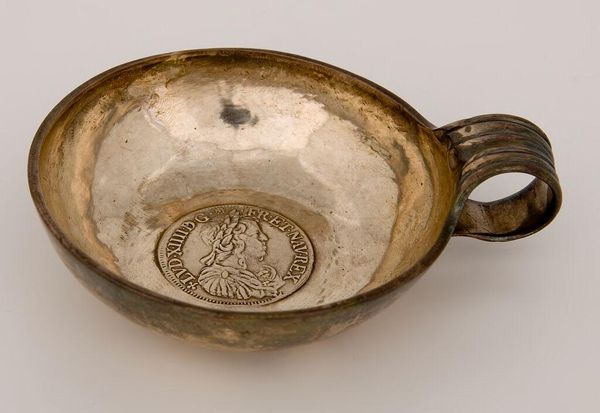 Curator: What immediately strikes me about this gilded cup is its texture. It's robustly, almost violently ornamented. Editor: This is a reproduction of a Gold Vapheio Cup; we attribute this version to Emile Gilliéron or his son. It is housed at the Harvard Art Museums and stands just under nine centimeters tall. Curator: The scenes of bull-catching hint at a primal drama, perhaps something akin to the Minoan bull-leaping rituals. Each figure is intensely wrought, nearly bursting from the cup's surface. Editor: The labor involved in creating such intricate details in metal is considerable. Think about the skill required to chase and emboss such a small, curved object. Curator: Exactly! This cup isn't merely functional; it's a vessel brimming with symbolic potency, each embossed figure contributing to a larger narrative. Editor: It highlights how even something utilitarian can become a site of intense craft and meaningful production. Curator: A potent symbol indeed, holding both material worth and historical echoes. Editor: A beautiful example of how process and culture meet.