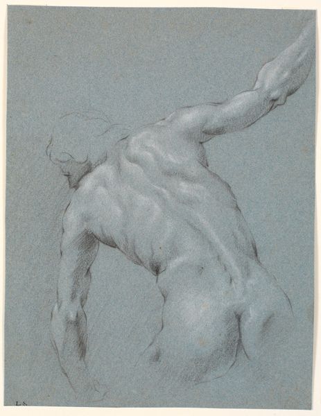 Heinrich Dittmers created this drawing of a male torso with chalk on paper. Dittmer lived in a time where gender roles and expectations were clearly defined, and depictions of the male body often celebrated strength. Consider how Dittmers approaches the male form. The model is reclined, his head lolling back. There's a vulnerability in this pose, as his chest is exposed and his eyes are closed. The emphasis isn't on heroic action but rather a quiet contemplation. The careful shading and anatomical precision speak to the intense study of the human form common in this era, yet the artist captures an intimate, unguarded moment. What does it mean to see a man depicted not as a symbol of power, but in a moment of quiet repose? Dittmers invites us to consider the multifaceted nature of identity, where strength and vulnerability coexist.