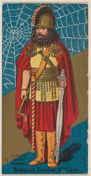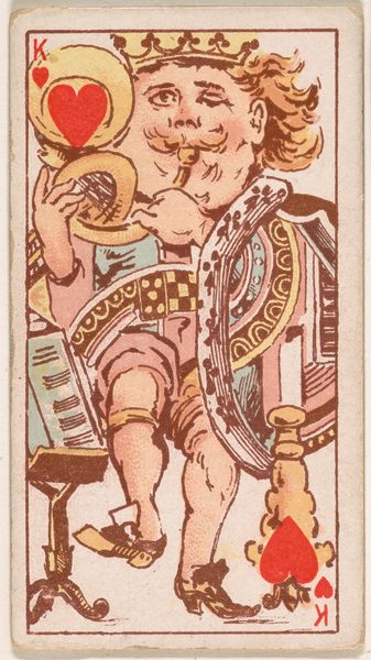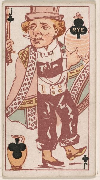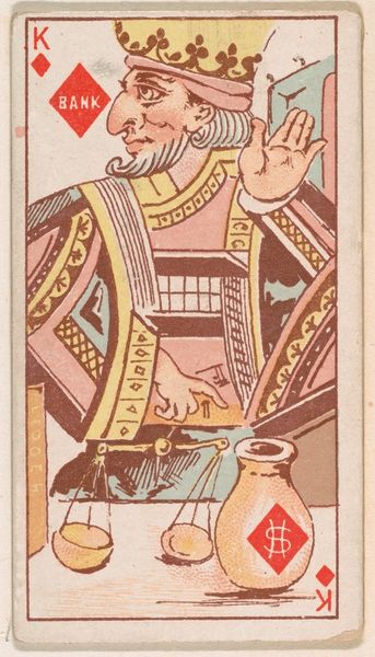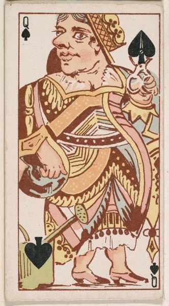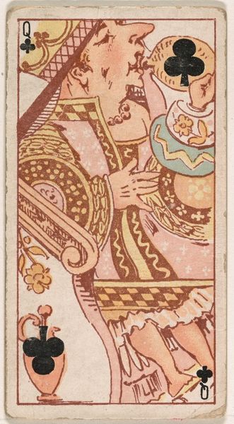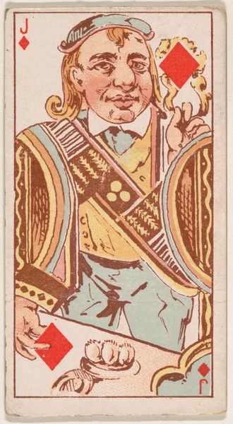 This is a card, 'Queen of Diamonds', from the Harlequin Cards series, created by Kinney Brothers Tobacco Company. The Queen’s symmetrical design, with its rhythmic use of geometric forms, immediately grabs your attention. The checkered collar and waistband create a visual rhythm that’s both decorative and strangely unsettling, destabilizing traditional notions of royal portraiture. The limited palette of reds, browns, and pale pinks further flattens the image, reducing depth and focusing our attention on the surface. The diamond suit, repeated as a motif, adds a layer of symbolic meaning. Diamonds often signify wealth and status. The Queen seems to be mocking these attributes. The very form challenges our expectations of representation. The card disrupts established meanings, inviting us to reconsider how symbols and signs function within popular culture. It reminds us that art, even in the most unassuming forms, can be a site of ongoing interpretation and re-interpretation.