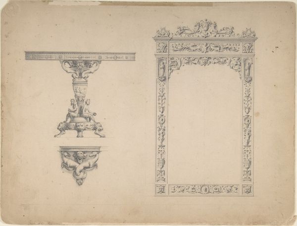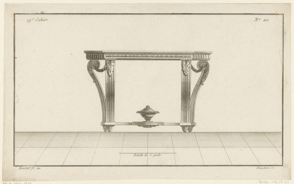 Jean Guillaume Blanchon created this drawing, "Tafel met vaas," featuring delicate lines on paper. The composition is strikingly symmetrical; the table is flanked by a vase, which gives it a formal, almost architectural presence. Light and shadow are indicated through subtle hatching, giving depth to the otherwise linear design. This drawing functions as more than just a depiction of furniture; it is a study in form and proportion. The precise rendering of ornamental details invites us to consider the underlying structure governing 18th-century design. Blanchon's interest in architectural accuracy and the balance of visual elements places this work within a broader discourse about enlightenment ideals of order and reason. Note how the linear perspective and the detailed execution are not merely aesthetic choices but also communicate ideas about space, order, and the very principles of design during this period. It prompts us to see beyond the surface, considering how the language of form can convey cultural and philosophical values.