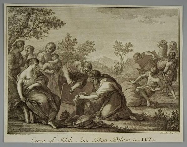 Editor: This is Francesco Rosaspina's "Abraham and Three Angels." It's a very classical composition. What strikes me is the contrast between the figures' dynamic poses and the stillness of the landscape. What do you see in this piece? Curator: The artist's use of chiaroscuro creates dramatic tension. Observe how the stark contrast emphasizes the physicality of the figures. Consider the implications of the balanced composition, the relationship between the earthly and the divine. How does it make you feel? Editor: It feels very formal, balanced. Curator: Yes. Rosaspina’s employment of line contributes significantly to the work’s overall impact. It underscores the classical ideals. This print showcases a mastery of technique, emphasizing the formal elements over pure narrative. Editor: It’s interesting how focusing on those elements, instead of the story, changes my perspective entirely. Curator: Indeed. Shifting focus unveils the structural rigor.