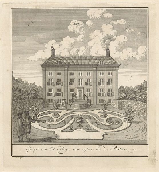 Jan Smit made this print of the Corvershof in Amsterdam, but we don’t know exactly when. This image gives us a glimpse into the spatial layout and social life of the Dutch elite. Here, we see the back facade of the Corvershof, a large building, likely owned by a wealthy family or institution. The composition emphasizes the geometric order of the building and gardens, reflecting the Dutch emphasis on rationality and control. The figures in the foreground, dressed in the fashion of the time, add a sense of scale and human presence, perhaps commenting on social hierarchies. The work may reflect the progressive values of the Dutch Republic in the 17th and 18th centuries. To understand the image better, one could research the history of the Corvershof and the social status of its inhabitants. This kind of inquiry will reveal the meanings embedded in the image.