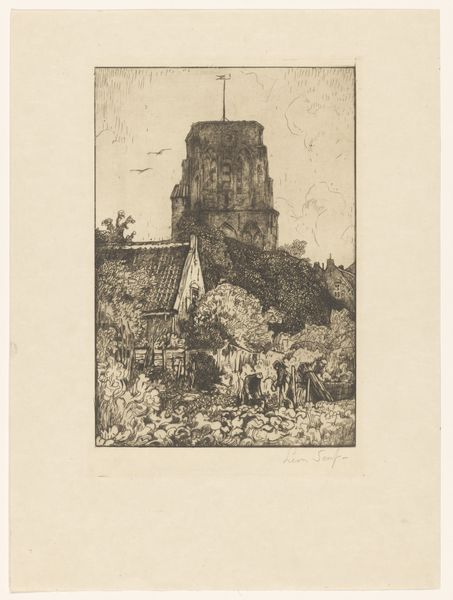 Arnoud Schaepkens etched this artwork called 'Three Soldiers by a Tower' without providing a specific date. Notice the tower: a potent symbol dominating the composition, evoking feelings of strength but also isolation, and a silent witness of the vicissitudes of time. Historically, towers are associated with defense, power, and refuge. However, they can also symbolize imprisonment or unattainable aspiration. The three soldiers introduce a human element to the scene. The image of the tower is embedded in our collective consciousness. It echoes through history, from the Tower of Babel in ancient texts to the medieval fortresses dotting Europe. Each iteration carries its own cultural and historical weight, yet the essence of the tower remains: a symbol of human ambition and its inherent limitations. Here, the tower stands as a testament to both human achievement and our fleeting existence. It speaks of the cyclical nature of history, where old forms reappear, transformed but still recognizable, engaging our subconscious with their enduring presence.