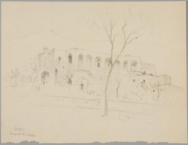 Curator: This is Denman Waldo Ross's sketch, "Landscape with Buildings, Palermo, Italy," part of the Harvard Art Museums collection. It's a small, intimate work done in pencil. Editor: It feels so immediate, almost like catching a breath of fresh air. The sketchiness lends a sense of fleeting beauty to the scene. Curator: Ross's approach to landscape is quite interesting. He seems to be capturing the essence of the place, not just a literal representation. There is a deliberate incompleteness here, a rawness. Editor: I'm drawn to the architectural elements, the suggestion of ancient arches against the backdrop of the hill. They whisper stories of a place steeped in history. It's more than just a landscape; it’s a memoryscape. Curator: Ross, as a teacher, was deeply concerned with aesthetics and formal qualities. I sense that he wanted to capture the tonal values. Editor: And the way the light almost dissolves the forms! It’s less about precision and more about atmosphere. I love how a simple pencil sketch can evoke so much. Curator: It's a lovely glimpse into Ross's practice, a reminder that beauty often lies in the simplest of observations. Editor: Absolutely, a fleeting impression captured with such sensitivity—Palermo through the eyes of an artist.