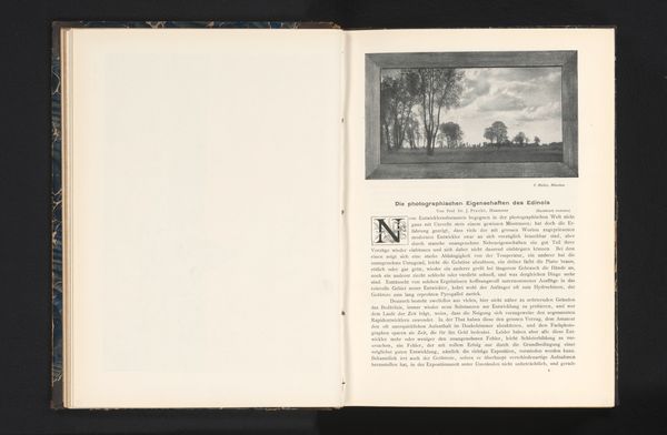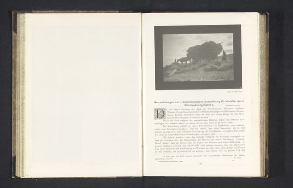 Curator: This image, "Bebossing bij avond," which translates to "Afforestation at Night," created before 1898 by Arthur G. da Cunha, employs photography in what seems to be a printed medium or possibly on textile. Editor: My immediate reaction is that the photo feels like a study in light and shadow. Those trees silhouetted against the dramatic sky evoke a strong sense of foreboding, even a kind of quiet terror, like a stage set for a Gothic novel. Curator: Considering its likely origins, it's crucial to understand da Cunha's photographic and print practices within the framework of late 19th-century aesthetic movements, particularly in the context of the Netherlands' colonial entanglements and artistic responses to industrialization. It's possible that such work aimed to re-assert the supposed natural world. Editor: The choice of imagery itself—the forest as a symbolic space— is fascinating. The forest, often perceived as wild and untamed, is culturally layered with symbolism tied to the collective unconscious. Consider fairy tales and folklore - it may evoke a sense of something unknown and potentially menacing in contrast to civilized spaces. Curator: Precisely. And the term "Afforestation" itself can imply reclamation, the conscious, perhaps aggressive attempt to tame or re-engineer nature—especially in spaces ravaged by the advent of modernity in that period. What narrative of dominance does it speak to, when a land, newly cultivated and captured on photographic printing can be bound into text? Editor: The symbolism feels particularly resonant given the context of colonization you bring up. The imposed will over the untamed and natural—but the tension here exists within that darkness. Look how even in its ordered, silhouetted nature, the scene manages to hold on to a shadow of the eerie. It really demonstrates our intrinsic unease with something "imposed". Curator: I’d add to that— that unease becomes critical as we assess whose "progress" or "improvement" this artwork truly speaks to. Editor: Thinking about it now, it is like looking at a story that is intentionally left unfinished, giving us both comfort and just a slight lingering disturbance. Curator: Yes—a provocation embedded in a seemingly tranquil scene that lingers long after the page is turned.