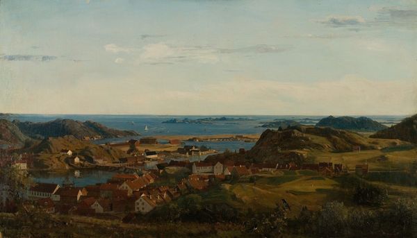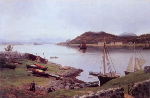 Editor: Here we have "Sandviksfjorden," a landscape rendered in oil on canvas by Hans Gude in 1879. There's a serenity to it, a kind of hushed stillness in the water and the sky, although it also looks quite moody. What draws your eye when you look at this piece? Curator: The water calls to me, wouldn't you agree? Notice how Gude uses light. Not like a sun-drenched Turner, but with subtle variations. It reminds me of memories, not quite forgotten but definitely tinged with time's patina. Do you ever feel a little melancholic, perhaps standing near the shore yourself? Editor: I can see what you mean; the light gives the scene a sense of depth and almost echoes this feeling of wistful peace, as if this moment could pass any second. So it's almost the ephemerality that touches you. Curator: Exactly! Look at the clouds brewing; they will likely change the way that sunlight bathes the fjord. Ephemeral, a reminder of life's constant motion, isn't it? A Romantic ideal that suggests this deep connection we have to the landscapes. I see the boat in the distance like a metaphor of how we are all moving. Do you see anything else that you find striking? Editor: I like the composition a lot, with its gentle shift from a dark shore to lighter sky, where these details like the ship and islands make the painting. The use of scales suggests distance, and as you mentioned, that time could fly. Curator: Ah, perspective! Just so. It’s funny, isn’t it? How paint on canvas, so still, can make us contemplate impermanence. Gives you goosebumps, almost! So, it is indeed the clouds that evoke this fleeting sense of beauty to both of us. Editor: It is! That romantic tension between tranquility and the passing of time has taught me a new way to view this art. Thanks!