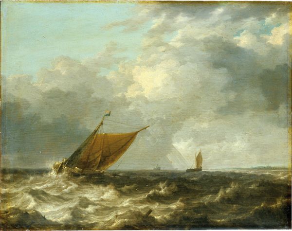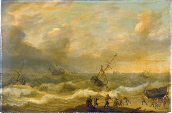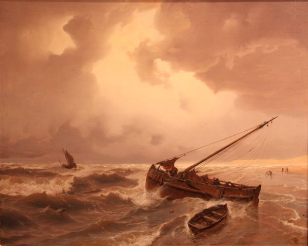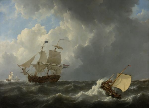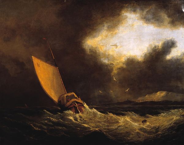 Curator: Talk about a mood. Just looking at it makes me want to wrap myself in a blanket and drink hot chocolate. Editor: I completely agree! "A Storm," created sometime between 1646 and 1708 by Ludolf Bakhuizen, certainly evokes powerful feelings. This oil on canvas, currently residing at the SMK in Copenhagen, throws us right into the thick of a maritime tempest. Curator: You know, the way he captures the sheer ferocity of the waves—it's like you can almost feel the spray on your face. There’s a ship caught in the throes of it all, looking so fragile. Editor: Absolutely. Consider the historical context. Dutch maritime power was at its peak during Bakhuizen's time. These seas weren’t just backdrops; they were crucial arteries of global trade and expansion. Storms like these represented very real threats. Curator: So, this isn't just a landscape, but also a commentary on human vulnerability against the backdrop of imperial ambition. Are we meant to empathize with the sailors struggling for survival, or to see the storm as a metaphor for the uncontrollable forces that could topple even the most powerful empires? Editor: Precisely. And thinking about the use of oil paint, you can almost sense the texture, that tactile connection to something so raw and unforgiving. I'm particularly drawn to the sky and water meeting with barely any discernible differences and that ship battling in it. It says a lot about control versus lack thereof. Curator: This certainly offers a lesson in perspective, not only on naval activity in that era, but what such pieces continue to embody when contemplating climate challenges now, too. Editor: Agreed. Its dramatic intensity keeps calling us back, inviting contemplation on both historical realities and our relationship with the environment now. What an impact, nearly three centuries later.