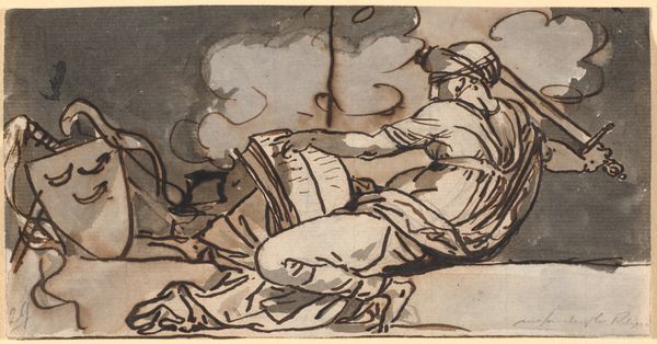 Editor: So this is "Liggende kvindefigur symboliserende den jødiske religion," or "Reclining female figure symbolizing the Jewish religion," an ink and pen drawing by Nicolai Abildgaard from around 1743 to 1809. It feels… allegorical, academic. What catches your eye here? Curator: For me, it’s how Abildgaard engages with the visual language of power and religion in a rapidly changing socio-political landscape. The reclining figure, representative of Judaism, is itself a loaded symbol. The broken tablets behind her could be read in multiple ways, signaling a rupture or a call to repair. Editor: Repair? Curator: Absolutely. How do we grapple with representing a complex identity through a single, possibly fractured image? And to consider Abildgaard's position, a white European artist portraying the Jewish faith – whose perspective are we really seeing? Whose story is being told? Editor: That’s fascinating. The figure seems to almost be guarding the tablets. Maybe she’s not broken, just… vigilant? Curator: Precisely! The artist perhaps acknowledges Judaism's resilience amid historical erasure and antisemitism, even if inadvertently. But also, what does it mean to position her, this personification, as both reclining—suggesting rest, perhaps weakness—and yet also guarding? Editor: So it’s a dialogue, between strength and vulnerability, visibility and misrepresentation… It definitely makes me see it in a different light now. Thanks! Curator: And thank you. It’s crucial to keep interrogating these visual narratives, their power, and their potential for both harm and understanding.