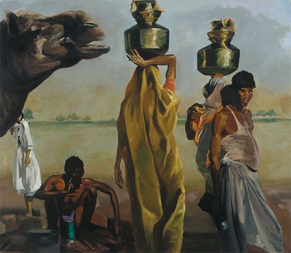 Editor: So, this is Lanise Howard's 2022 piece, "To be Moveth like the Wind," made with oils and acrylics. I’m really struck by the almost dreamlike quality of the scene and this separation between two groups of people. What's your take? Curator: The division into two panels, each featuring figures walking across a grassy landscape, definitely evokes a sense of transition. Given Howard's interest in narratives of Black identity, how do you think we can view this piece in relation to movement, freedom, and perhaps even displacement within the African diaspora? Editor: That’s interesting! The figures, especially on the right side, holding hands, makes me think about togetherness, a journey shared by women and men in pursuit of something. Is the artist using the figures’ arrangement in some symbolic way? Curator: Exactly. The arrangement of the figures – the groupings, the holding of hands – could be interpreted as symbolic gestures, embodying concepts of unity and shared experiences of identity and resistance. Could this formation, in your view, suggest strategies of resilience, echoing communal strengths that emerged within historical oppression and segregation? Editor: That makes sense, especially considering the almost ethereal, timeless quality of the clothing they wear, or don’t wear. So much history is suggested by the images and relationships. It creates tension because of all of its unknown meaning, but meaning seems really key. Curator: The title "To be Moveth like the Wind" is so important in how we can decode this imagery as well. This movement signifies agency. Where do you think the artist sits in their personal expression and also as an act of resistance that seeks empowerment for all of us to find inspiration within this artwork? Editor: That’s really helpful in understanding where this artwork fits into a wider conversation, especially knowing that narrative tradition is such a huge part of our collective experience. Curator: I completely agree. By looking through the lens of movement and historical struggle we also invite our audience into discussions of Black identity as lived and self-defined experience.
