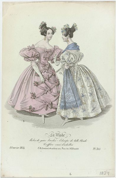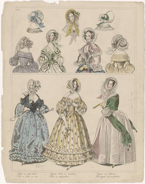 Curator: Ah, the delicious details of fashion! This print, titled "The World of Fashion, May 1828," is a peek into the morning, walking, and evening dresses of the time. The artist is William Wolfe Alais. Editor: My goodness, talk about accessorizing! The hats alone could launch a thousand ships. The whole image has this airy, watercolour dreaminess, but also a rigid formality, it is quite intriguing. Curator: Absolutely! Alais used ink and watercolor, typical for fashion plates of the era, allowing for delicate lines and subtle color gradations to showcase the fabrics and embellishments. Fashion publications were a burgeoning industry back then. Editor: So, it is almost a news source, telling ladies what is trending, what they should be coveting next. And notice how the women, while individually styled, are grouped together almost like mannequins in a shop window. It really underlines the performance of status. Curator: Precisely! This print would have circulated amongst the aspirational classes. I think it serves almost as a kind of proto-Instagram. But there is an ambivalence here, too. The delicacy contrasts quite starkly with the commercial context of its production and use. Does that read? Editor: It is there—the whole look is aspirational, a bit over-the-top, a tad ridiculous even. So very chic but the scale is a little off, something uncanny lurks. It highlights the human desire for transformation and fitting into the upper stratum. Do you think that the fashions changed very quickly or was it just like an upgrade? Curator: Fashion moved at a clip, perhaps a tad slower than today. Each new season was ripe for signaling belonging, so these prints served as a visual handbook of who’s who and what’s what. And if we remember that, historically, clothing regulations have always been socio-economic regulation also, then they became instruments. Editor: Fashion as social commentary! I never thought to look at it that way, even while finding its frivolity to be quietly haunting. This piece has much more than meets the eye! Curator: Precisely. Next time you’re pondering your outfit, remember the echoes of those May 1828 morning and evening dresses. What hidden stories and messages are *you* communicating?