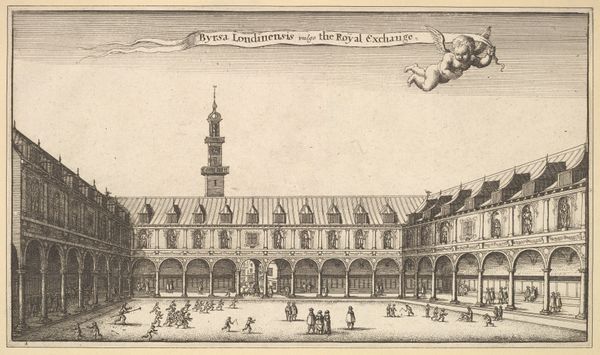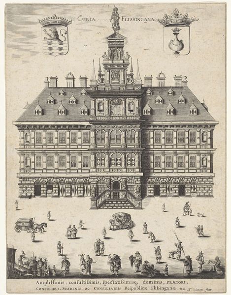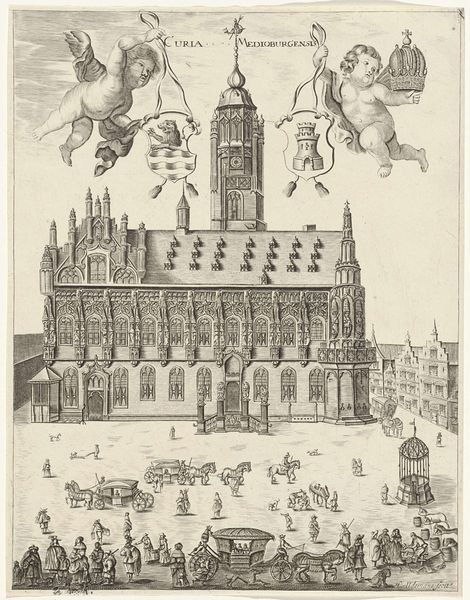 Hendrik Udemans created this print of the Veere Town Hall sometime between 1640 and 1660, capturing not just the architecture but a moment in the life of the city. The Dutch Golden Age was a period of immense economic and cultural growth for the Netherlands, deeply intertwined with its colonial activities and global trade networks. Udemans, positioned within this era, produces an image that subtly reflects the societal values and structures of his time. Notice how the town hall, a symbol of civic authority, is rendered with meticulous detail, while the figures populating the square seem almost generic. The print subtly highlights the hierarchy of labor and class. It invites us to consider whose stories are visibly represented and whose are marginalized within these historical narratives. How do we reconcile the celebration of Dutch prosperity with the exploitation that fueled it? This image then becomes a poignant reminder of the complexities inherent in historical representation, urging us to look beyond the surface and ask critical questions about power, identity, and memory.