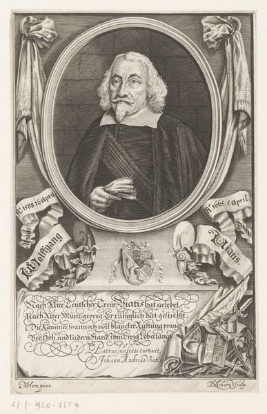This is Conrad Buno’s portrait of Joachim Lütkemann, an engraving of impressive detail. The work is dominated by the figure of Lütkemann, framed within an octagonal border. The engraver’s meticulous lines create a range of textures, from the soft curls of Lütkemann’s hair to the elaborate patterns of his attire. The composition, though conventional for its time, uses subtle variations in line and shading to suggest depth and character. The subject's gaze, slightly averted, adds an element of introspection, inviting the viewer to consider the sitter's inner thoughts. The octagonal frame functions as a structural device that contains the portrait while also suggesting a break from traditional portraiture's fixed forms. Ultimately, this engraving is not just a representation of an individual. It functions as a complex interplay of signs and symbols that reflect both the sitter’s status and the broader cultural values of the period. It encourages ongoing re-interpretation and debate.
