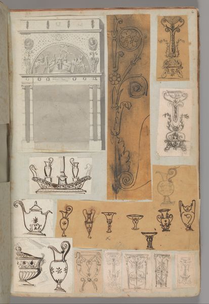 Curator: This page comes from a scrapbook by Charles Percier, dating from 1795 to 1805. It’s currently housed at the Metropolitan Museum of Art. We see a compilation of architectural drawings and prints, interior designs, furniture sketches, and other miscellaneous objects, all meticulously rendered. Editor: My first impression is one of intimacy and exploration. There's a beautiful chaos to it—like stumbling upon the artist's private thoughts. The delicate pencil work and the variations in scale give the impression of a fertile mind at work. Curator: Absolutely. Percier was a leading figure in the neoclassical movement, and this page offers a glimpse into the artistic process behind that aesthetic. Notice the recurring motifs: classical columns, wreaths, and geometric patterns. These reflect the era’s fascination with antiquity. Editor: Yes, and when considering material conditions and processes, the act of compiling this scrapbook becomes significant. Paper was relatively precious then. Percier, in gathering his sketches together like this, transforms mundane ephemera into something carefully considered, blurring boundaries of what could be regarded as art. It feels like proto-industrial design in formation. Curator: That's an interesting point about blurring boundaries. Given that this scrapbook would have served a deeply personal, perhaps even private function for the artist, in what ways can we interrogate the scrapbook form itself? After all, aren’t sketchbooks and personal collections an intimate portal to gendered labor and social activity? Editor: It prompts us to ask questions about design consumption and aesthetic desires. Percier wasn't simply drawing; he was visualizing how people might live, the objects they’d use and want. What did such intense visualization require for a particular class of consumers during the late 1700s and early 1800s? Curator: Ultimately, this seemingly simple page unlocks a richer understanding of the historical and social context that shaped Percier's artistic vision. It becomes a tapestry that unites material reality with aesthetic ambition. Editor: Indeed, analyzing the paper, pencils and ink used allows for a much deeper insight into 18th Century industrial practices and class divides and into who consumes the material results from the age. These materials offer tangible evidence about production and manufacturing in order to comprehend labor divisions based on the artwork created.