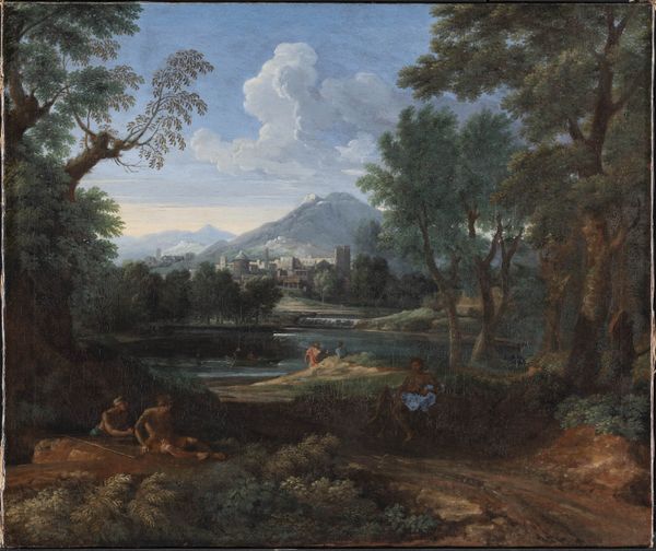 Giovanni Maldura made this painting, David at the Cave of Adullam, using oil on canvas. In its making, we see a world still dominated by hand skills. Paint, ground pigments mixed with linseed oil, is inherently slow. It can be built up in layers, each demanding time and patience. With each considered brushstroke, Maldura invites us to consider the nature of the landscape: the subtle gradations of light across the valley, the texture of the rocky outcrop, the delicate foliage of the trees. Look closely, and you'll notice figures strategically placed; with their presence Maldura hints at narrative, and suggests larger social dramas playing out within this vast, open space. Despite the traditional materials, the artist is clearly aware of the changing social and economic context within which he operated. It’s worth considering the sheer labor involved in the production of a painting like this, from preparing the canvas to the final application of varnish. By focusing on these material aspects, we can appreciate how the painting reflects the artist's labor and skill.