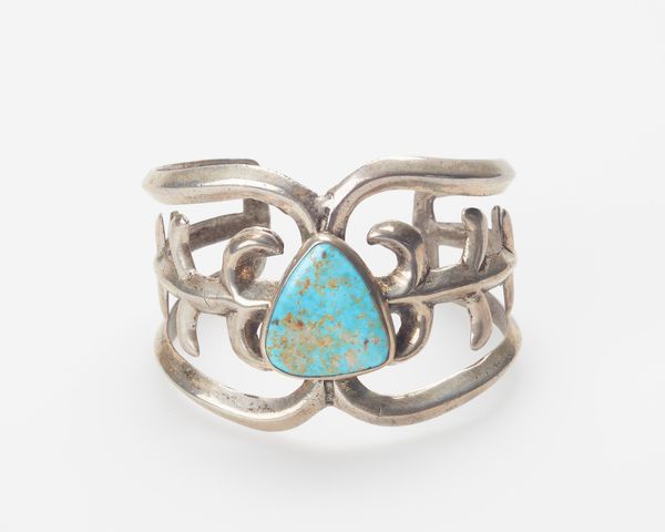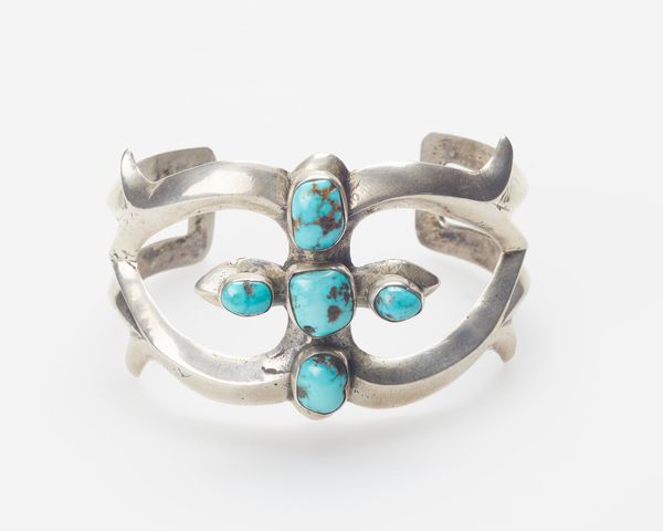 Editor: Here we have a silver bracelet by a Navajo artist dating to around the 1940s. What strikes me most is the balance between the smooth, polished metal and the intricate stamped designs. What elements of this work do you find most compelling? Curator: Note the interplay between the linear elements—arrows and geometric forms—and the single turquoise cabochon. The composition adheres to principles of symmetry, yet the slight variations in the stamping suggest an individuality within a formal structure. The turquoise acts as a focal point, its color contrasting beautifully with the muted silver. Do you observe how the etched linework directs the gaze inward? Editor: I do! It’s almost like the arrows point both toward the stone and outward at the same time. I hadn't thought of the formal structure until you pointed it out. Curator: The artist’s choice of a cuff design also implies an understanding of form, enabling direct contact with the wearer's skin and subtly underscoring the artwork’s tactile quality. Further consideration might be afforded to how light reflects across its varied surfaces and the way the simple lines contribute to the complexity. Editor: It’s interesting how seemingly simple design elements can result in something so striking. I appreciate your formalist perspective! It certainly enhances my perception and the artwork's inherent visual complexity. Curator: Indeed, it provides a framework for a more nuanced consideration of the piece itself.