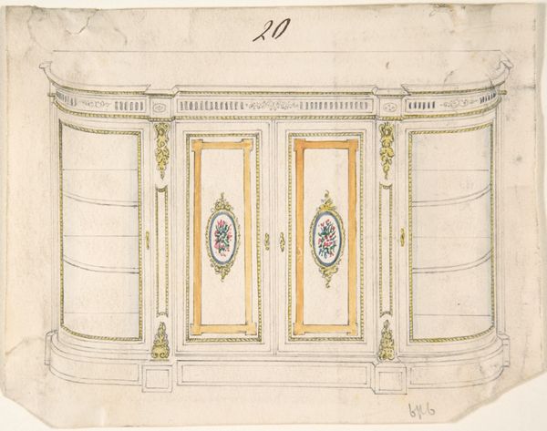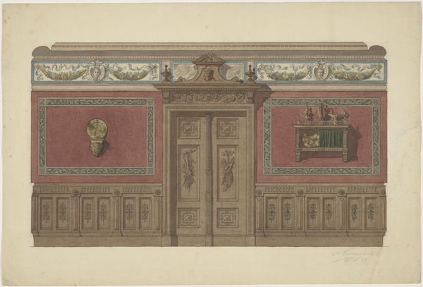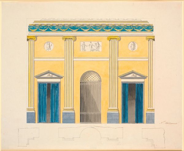 Editor: So, here we have Nicolai Abildgaard's "Den anden langvæg. Udkast til dekoration af audienssalen," or "The second long wall. Design for the decoration of the audience hall," made in the 1790s. It's a pencil drawing. Looking at this design, it strikes me as so orderly, but strangely lifeless. What do you make of it? Curator: Lifeless, you say? It certainly has that cool, almost aloof neoclassical air, doesn't it? Imagine this on a grand scale, though—think echoing voices, the rustle of silk, the weight of power. Abildgaard wasn’t just drawing lines; he was crafting an environment intended to project authority. Editor: Authority through… doors? I mean, what's the point of depicting architectural elements in such detail? Curator: It’s about more than just doors, isn't it? Look at the balanced composition, the carefully placed friezes. Consider the intellectual climate of the time—the Enlightenment’s fascination with reason and order reflected in the clean lines and classical motifs. Abildgaard is attempting to align the Danish monarchy with the grandeur of ancient Greece and Rome. It's a statement. Do you see it now? Editor: I think so! The details amplify the message. Were those turquoise accents common then, or a bit of personal flair? Curator: Excellent question! The blue is, shall we say, interesting. That chromatic freedom hints that Abildgaard was pushing beyond strict academic restraint. Perhaps revealing the artist's subtle touch, and possibly for specific reasons like room light and space, all part of an intelligent composition strategy, where personal intuition elevates historical imitation. Editor: That's so interesting! So much intention hidden within what seems like a rigid framework. It does have a pulse after all. Curator: Exactly! Art isn’t just about what you see, but how you learn to see.