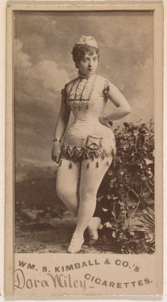 Curator: Here we have a trade card from the 1880s, specifically "Card Number 610, Lillian Baldwin, from the Actors and Actresses series (N145-3)." It was issued by W. Duke, Sons & Co. to promote their Cross Cut Cigarettes. Editor: My first impression is how posed and theatrical it feels, yet somewhat melancholy. The sepia tones contribute to this feeling, but also that it clearly belongs to the tradition of genre paintings. There is almost too much weight, which flattens the whole image despite the light on the face. Curator: Genre is definitely the key. Consider what a "star" signified in those early days of mass media, an archetype promoted to sell, as well as idealize feminine beauty through Lillian's body, costuming, and gaze, each carrying distinct cultural meaning. Notice how her figure echoes classical statuary, simultaneously idealizing her form but also suggesting the transience of her fame. Editor: Right, and to produce these cards, Duke used photo-lithography, enabling mass reproduction and widespread distribution. The industrial scale of tobacco production directly informs the card’s existence; advertising and distribution being entirely crucial to the entire business model. That cigarette card became a unit of exchange of consumerist desire itself. Curator: Precisely! It reveals how consumerism appropriates and re-presents culturally established archetypes to fuel sales. The portrait isn’t simply a likeness, but a loaded signifier acting on our desires, even across generations. It's hard not to view it with suspicion in the post-truth, manipulative visual culture we're immersed in now. Editor: I see it more as a crystallization of complex social forces—the rise of celebrity culture, the expanding reach of industrial capitalism, even the shifting roles and expectations of women. It's not a “simple” advertisement at all. The artist in the factory as much as the one celebrated in museums. The card then became a readily available surface, circulated from factory to consumer, reflecting these rapid transformations in culture and materials of the day. Curator: Absolutely. And understanding how it functions symbolically enhances our appreciation of those transformations and what remains true, across changing meanings. Editor: Exactly. Examining the methods behind such artwork really opens up our view of both the industry and those represented.