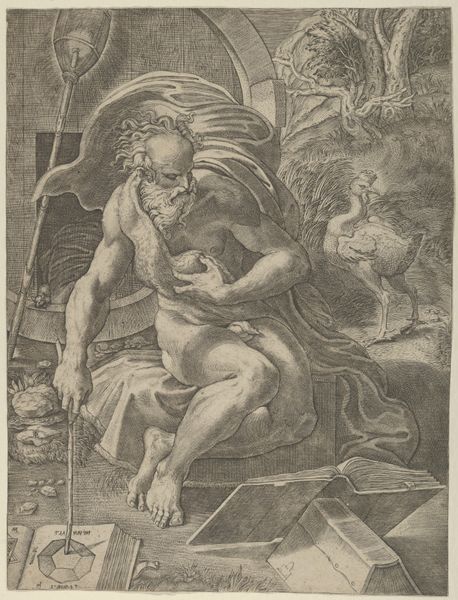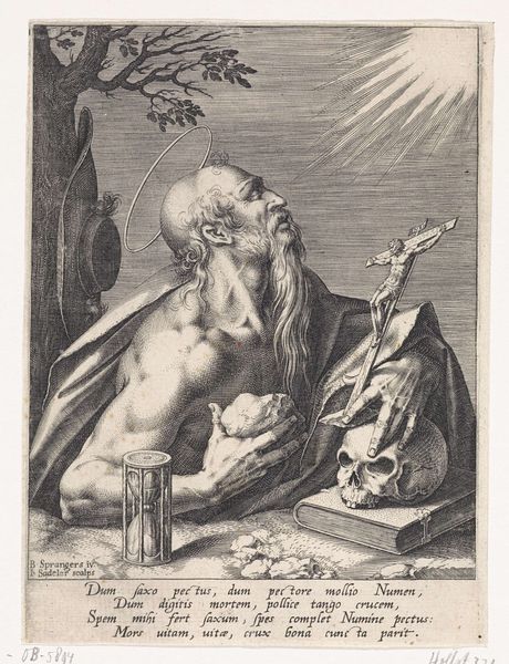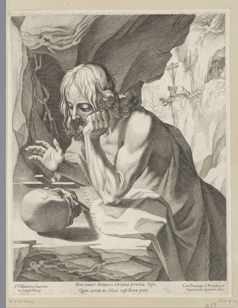 Curator: This engraving, dating from before 1663, depicts "Saint Jerome," and is held at the Rijksmuseum. The stark use of light immediately captures a sense of ascetic isolation. Editor: Yes, a real tenebrism happening here. There's an emotional density emanating from the image—it's hard not to project feelings of exhaustion and contemplation, themes so prevalent when representing the scholarly recluse in art. Curator: Agreed. Observe the deliberate deployment of chiaroscuro. The contrast isn’t just decorative. It sculpts form, certainly, but more importantly, establishes a visual hierarchy, drawing attention to the skeletal figure and devotional items. The saint's body, rendered with almost clinical detail, shows how mastery of line creates volume and texture, defining musculature and aging skin. Editor: The choice of Saint Jerome also positions this work within a complex lineage of religious art meant to evoke empathy, particularly within Counter-Reformation art. He is the translator of the Vulgate Bible—and yet this engraving also presents an aging scholar confronting his own mortality. The skull is a strong visual reminder. It places the saint in an awkward place between his intellectual and bodily duties, as well as life and death. Curator: Precisely! This compositional dichotomy adds layers of meaning beyond the surface portrayal, enriching our understanding of spiritual introspection and the temporal transience of the flesh. Editor: Perhaps it makes sense, therefore, that the text includes the line: Ventura Salimbenius pictor Sen'. It marks an authorship but perhaps also acknowledges a visual culture of engraving that existed at this moment, referencing collective memory. Curator: The work presents an artistic construction where rigorous technique meets layered allegorical representation. Editor: An intriguing demonstration of how religious symbolism intersects with political power and questions of identity.