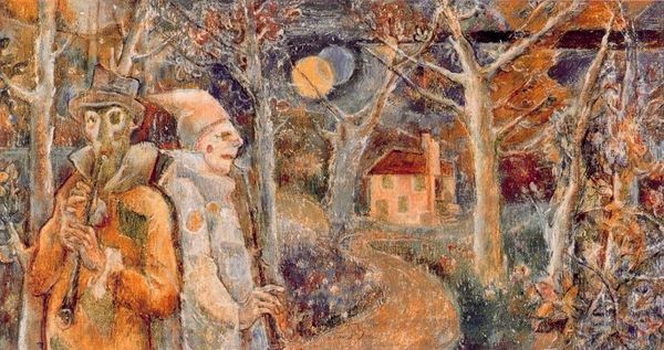 Lajos Gulacsy created *The Madman and the Soldier*, a painting where the figures emerge from a muted, earthy backdrop. The textures are layered, giving a sense of depth and revealing the artist's process. The colours here are desaturated, predominantly greens, browns and reds, which create a dreamlike, unsettling atmosphere. Gulacsy plays with the semiotics of madness and militarism, inviting us to question their established meanings. The composition feels slightly off-kilter, as if the world is tilting on its axis. It appears as if Gulacsy is using the figures to challenge fixed identities and explore the fluidity of perception. Perhaps this is a reflection of broader philosophical concerns that question the stability of truth and reality. The layered textures in *The Madman and the Soldier* function as a visual metaphor for the complexities of identity, perception and the human condition. Through the destabilisation of form and meaning, Gulacsy invites ongoing interpretation.
