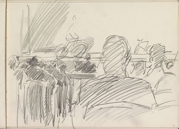 Editor: This is Isaac Israels' "Figuren in een interieur," created sometime between 1875 and 1934. It's an ink drawing currently housed here at the Rijksmuseum. I’m struck by its raw energy. It feels incomplete yet captivating. What formal elements stand out to you? Curator: The piece foregrounds the expressive potential of line. Note how the density of the cross-hatching defines volume and suggests the fall of light, while simultaneously flattening the pictorial space. The rapid, gestural quality implies a sense of immediacy, a capturing of a fleeting moment. Do you see how the composition avoids a clear focal point? Editor: Yes, it's almost like a chaotic arrangement. The figures seem to blend into the background, with no single form dominating. Is that intentional? Curator: Precisely. By denying a traditional hierarchy, Israels challenges our conventional reading of figure-ground relationships. The interplay between positive and negative space becomes equally significant. Observe, too, how the artist employs varying degrees of tonal contrast. The strategic deployment of darker areas serves to anchor the composition, providing a sense of structure amidst the apparent chaos. Editor: It's interesting how much information he conveys with so few lines. Almost like shorthand. Curator: Indeed. He distills form to its barest essence, inviting us to complete the image in our minds. It provokes thought about the essence of representation itself and how meaning can arise from what is not explicitly depicted. It begs us to appreciate its incompletion. Editor: I never thought about it that way. I focused on the impressionistic sketchiness, but now I notice the thought put into tonal composition and form abstraction. Curator: By focusing on line and form, and their expressive potential, we can glean a lot about the artistic intentions in this work.