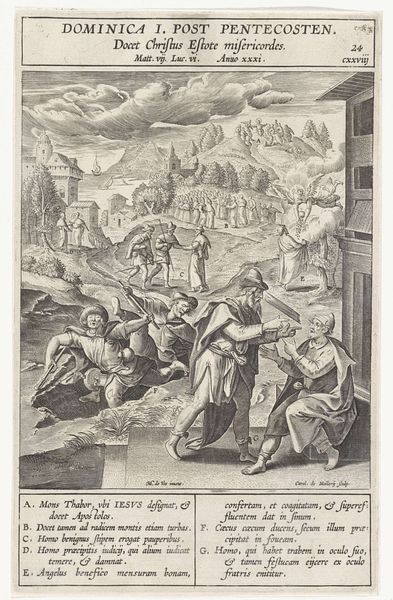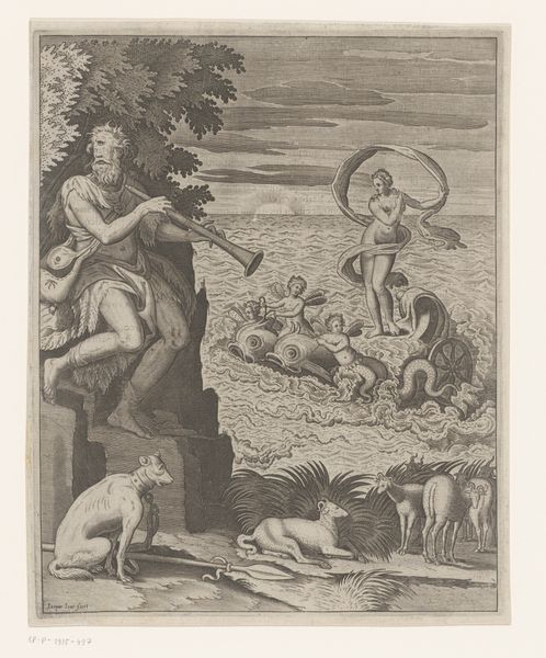 Curator: Today we are looking at a 17th-century engraving titled "Den fortabte søn som svinehyrde"—"The Prodigal Son as Swineherd." It's by an anonymous artist, part of the SMK collection. And it presents a vivid depiction of, well, the prodigal son in a rather unfortunate situation. Editor: My immediate reaction? It’s quite earthy. The textures conveyed purely through line work! The contrast between the fine details of the swine and the overall grittiness feels, dare I say, incredibly appropriate. It reminds me of the saying about "wallowing in it"—he's literally doing that, isn't he? Curator: Indeed! It's an image steeped in symbolism. The very medium of engraving lends itself to such stark contrasts, doesn't it? Think about the laborious process—the careful cutting, the deliberate inking—each step mirroring the son's slow descent and the grinding reality of his circumstances. The contrast highlights the moral of this genre painting. Editor: It’s interesting that you mention labor. The act of engraving mirrors the very labor the prodigal son is reduced to: a craft that demands both precision and endurance, feeding swine instead of inheriting generational wealth. The consumption involved both literally, in terms of food and gluttony. Curator: Absolutely, it's all very material, isn't it? Notice the crude wooden trough from which the swine are feeding. It's such a contrast to what he has wasted! Editor: The very essence of being human—reduction into tools to create material excess. Think of all those perfectly rendered hairs on the pigs, each tiny engraved line! Even now this work becomes a luxury object that obscures it origins in base labour. It brings new perspective to this common fable! Curator: I agree. It invites introspection on waste, labor, humility, and redemption. This engraving serves as a powerful testament to the era's social mores and the human condition itself, brought into the context of materiality. Editor: A fitting parable rendered in a most revealing and, frankly, stomach-churning form. A deep lesson of consumption, but a clear message about the work ethic!