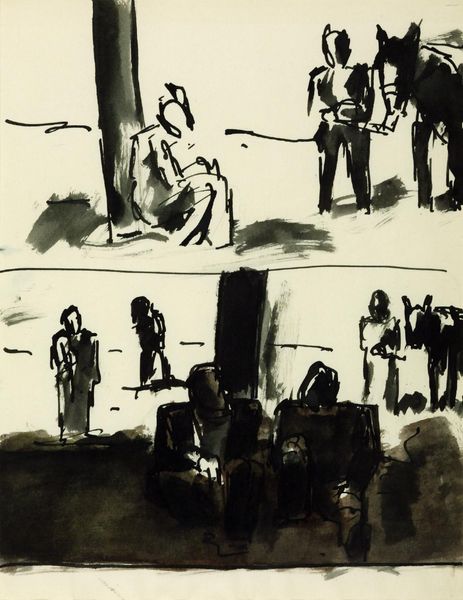 Curator: We’re looking at Marlene Dumas’s acrylic painting, “The Wall,” completed in 2009. It's a powerfully understated figuration piece. What's your immediate take? Editor: Stark. Visually and emotionally. The constrained palette of blacks, whites, and grays emphasizes the materiality of the scene while hinting at the weighty themes embedded here. What historical framework is relevant for a piece like this? Curator: Dumas, born in South Africa under apartheid, often deals with issues of identity, racism, and mortality. Considering the work in that context adds a deeper layer. The stark portrayal and implied barrier invite conversations on separation, segregation, and shared spaces, so what you called “material” feels significant. Editor: Precisely. The thick acrylic applied gesturally hints at a layered reality—not just physical barriers, but socially constructed ones, too. The raw brushstrokes give the sense of things hastily assembled, almost precarious. One can feel a tangible vulnerability about them. Curator: Agreed. Its very composition underscores the weight of historical divides. I can't help but ponder the impact this piece had on gallery visitors, especially in post-apartheid discourse. Editor: Didactic art becomes redundant. These blurred faces, generic clothes… they represent labour, congregation, ritual... In terms of what materials can express, there’s something about how these subjects look similar but possess an individual emotion that can affect any and every audience member, religious or not. Curator: Exactly, Dumas captures these poignant moments between individual experience and larger cultural phenomena so adeptly. "The Wall" is a reflection on shared heritage and persistent fractures, which makes this encounter simultaneously deeply personal and historically important. Editor: So in essence, the piece’s inherent value resides not only in aesthetic presentation, but its power as a social mirror for cultural fault lines, if you will. Thank you. Curator: And you. Its ability to subtly highlight complex dynamics speaks volumes, as well.