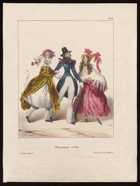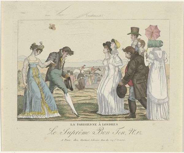 Curator: Look at this print by Eugène-Louis Lami, created in 1833. It’s titled "Caricature. No. 3. 2eme Pie. La noce de la fille du fermier"—roughly translated, “The wedding of the farmer’s daughter.” It’s a lithograph, enhanced with watercolor and pen, from a series depicting scenes of French life. Editor: Well, first impression: the composition, even with that sepia tone, feels lively. The figures are quite stylized, with almost cartoonish exaggeration. I'm drawn to how their clothing signifies social class. The details in the textile prints of their clothes, particularly the dresses, is beautiful. Curator: Absolutely. Lami, who was later known for his depictions of military life, here presents a more intimate and arguably critical view of social interactions in France during the early 19th century. Notice how he places this farmer's wedding "caricature" in contrast with the military presence— the officer, quite stiff, almost disapproving. This was during the Restoration period, so class tensions were definitely fodder for artists and satirists alike. Editor: The medium used—lithography— is crucial here too. Prints democratized artmaking in the nineteenth century because artists could rapidly produce imagery addressing class structures and the politics surrounding such hierarchies, while being more accessible than the canvases you would have seen in aristocratic households. Lami combines etching, watercolor, and pen marks with the lithographic print, to imbue more labor into his work, signifying its unique process and high value. Curator: Indeed. The clothing also strikes me as indicative of that post-Revolutionary anxiety around social mobility. Some are trying hard to imitate aristocratic fashion, others are clinging to more traditional rural attire. And it is not as idealized or polished, the Romanticism style that dominates high art, for example in paintings depicting historical narratives, so in itself already constitutes an opinion regarding the value of "history". Editor: I like your read of those clashing styles as anxiety. But I also appreciate seeing how such materials as dresses would have actually looked through textile and pattern work during that era. What I wonder about now, given this being a satire, are Lami's actual opinions regarding this display of economic disparities. Curator: That is a question that has lingered for decades. I'd say that his visual approach and medium—reproducible images that could be consumed and shared widely—suggest a certain inclination. Food for thought about the democratization of representation during times of radical societal change! Editor: I think understanding print media and the rise of democratization are key to accessing this piece’s complexities and to re-thinking its Romantic visual treatment. Thanks for discussing Lami with me!