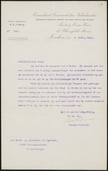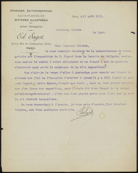 Curator: We are looking at “Brief aan Philip Zilcken,” dating probably from 1903 to 1917, consisting of a print and drawing on paper. The text includes typography and what appears to be a signature. Editor: The muted colors and formal lettering give it a feel of restrained formality, something institutional and perhaps a bit austere. It gives an initial impression of administrative weight and subtle cultural significance. Curator: The letter is from the Chambre Syndicale Corporative Française De la Gravure sur Bois, relating to their publication "Image." In essence, it acknowledges and expresses gratitude to Monsieur Zilcken for agreeing to provide patronage. Within the French societal structure of the early 20th century, art patronage played a vital role, often dictated by hierarchies and systems of prestige. This letter embodies the codified and structured nature of the period’s artistic endorsement. Editor: Notice how the text, seemingly straightforward, also projects subtle hierarchical symbolism. The careful choice of typography and placement of "Monsieur" denote a respectful distance but also subtly acknowledge Zilcken's status within their social circle. Curator: Exactly. Understanding the power dynamics embedded within artistic patronage allows us to reflect on the artist's agency during this period. These endorsements held great meaning for movements of the time, influencing visibility and acceptance. How did such a gesture then inform contemporary notions of support, celebrity, and marketing in art? Editor: Well, looking deeper at this piece, it brings up the role of the "Comité" or committee as cultural gatekeepers. The committee and Monsieur Zilcken become powerful symbols themselves, representing both the centralized authority over taste and aesthetic values of early 20th-century French artistic institutions. How was this sense of authority translated in art circles over time? Curator: Perhaps, it would have shifted to individual critics, but it also evolved into different forms of group consensus, like the rise of collective studios and politically oriented workshops later in the century. Considering this letter through the lenses of post-structuralist discourse allows us to unpick hidden power relations influencing aesthetic value and canon-formation in the context of gender and class inequality in arts. Editor: Indeed. It is a letter about support that ultimately leaves us to consider notions of historical visibility and artistic valuation. Curator: Precisely. A glimpse into a world shaped by social and financial dynamics that continue to echo in our modern creative landscape.