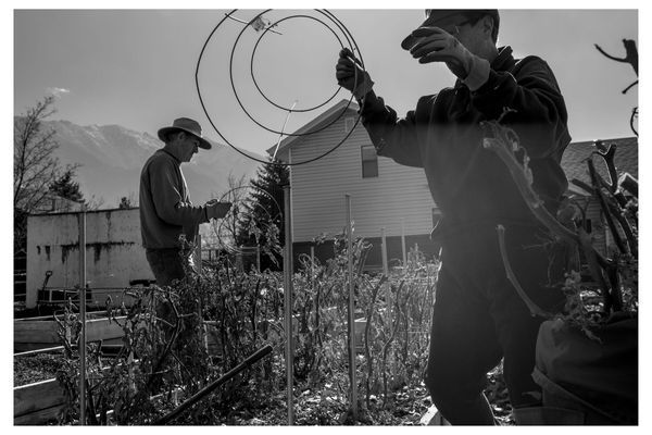 Curator: Ashley Gilbertson captured this image, titled "A resident talks to workers in the Hunters Point neighborhood of San Francisco, California," in 2017. Editor: It strikes me as a scene heavy with unspoken tensions. The black and white format emphasizes the stark divide between the figures. Curator: The scene is indeed a visual metaphor. The resident, facing workers in protective gear, speaks to a larger history of environmental injustice. The image evokes a sense of unease through the juxtaposition of domesticity and hazard. Editor: Exactly. The workers are literally digging into the earth, unearthing something, while the resident seems to be confronting them. This image serves as a reminder of the disproportionate impact of environmental hazards on marginalized communities. Curator: The composition places the resident at eye level, and the workers below, as if to give her the power to reclaim the land. The workers' white suits stand out against the dark soil, a symbol of contamination. Editor: It’s a powerful commentary on power dynamics and the fight for environmental justice in communities like Hunters Point. It leaves me pondering the legacy of industrial contamination and its continuing impact. Curator: Yes, it's a moment frozen in time, a conversation laden with historical weight.