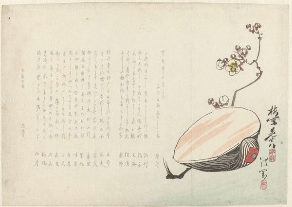 This print, "Kamuro bij offertafel," was created by Mori Ippô in Japan. At first glance, the composition divides into two distinct fields: one dominated by text, the other by figuration. The right segment depicts a woman with intricate hair ornaments, clad in a blue kimono decorated with small, vibrant floral patterns. To her side, we see a small table laden with offerings. The table is composed of vertical and horizontal lines, and set back to be viewed from above. The woman is positioned in a way that her gaze seems to be directed towards the offerings on the table. In contrast, the left side is dense with vertical lines of script. The linearity of the script opposes the curves in the figure, and the dark against light gives a sense of depth. The dual nature suggests a structured interplay between the visual and the textual, inviting us to consider how each element informs the other. The print does not offer a singular, fixed narrative, but rather invites an ongoing process of interpretation.