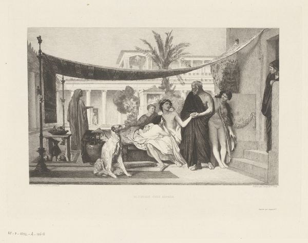 Editor: So, we're looking at Lawrence Alma-Tadema's "At the Shrine of Venus", dating from 1884 to 1894. It’s a drawing and a print, held here at the Metropolitan Museum of Art. What strikes me immediately is its quiet intimacy, a moment captured in this bustling scene, somehow still and reflective. What do you see in this piece? Curator: Oh, it's delightful, isn't it? Tadema was a master of conjuring these Roman fantasies. To me, it's not just about historical accuracy; it's about creating a mood, a sensual experience. Look at the light filtering through—it feels almost theatrical, a stage set. Do you get that sense, too? Like a glimpse into a secret world? Editor: Definitely! It’s like we're peeking in. Are the women even aware of the others in the scene? It seems the artist emphasizes their interiority more. Curator: Precisely! And that's the clever trick, isn't it? He invites us into their private space, a space where beauty and leisure reign supreme. What do you make of the contrast between the relaxed women and the formal ritual at the shrine? It almost feels subversive, a quiet rebellion against pious duty. What if the true devotion isn’t towards Venus herself, but rather, toward beauty and self-adornment? Editor: That’s an interesting point – that these women are not even facing the shrine but turned inward in this space that is all about presentation of self. It changes the tone. Thanks for showing me a fresh perspective on the piece. Curator: My pleasure. It’s works like these that remind us art can be about transporting the soul, a tiny portal. A chance to feel something utterly outside our daily grind. I'll need a beauty ritual of my own now, darling, if you'll excuse me.