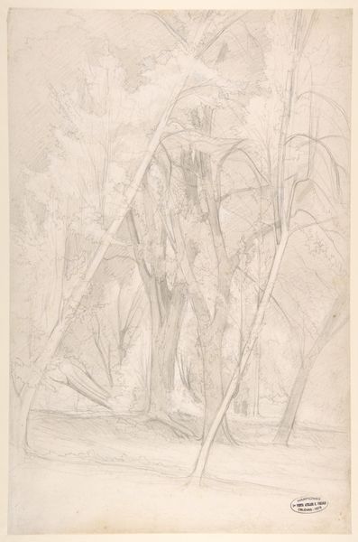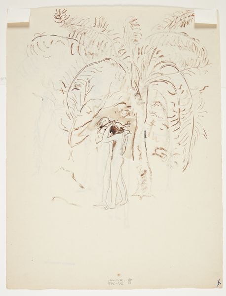 Editor: Here we have Gudrun Traustedt's ink drawing, "Uddrivelsen af Paradiset," or "The Expulsion from Paradise," created sometime between 1915 and 1924. There’s a definite raw energy to the sketchiness, like the whole scene is vibrating with some unspoken emotion. I wonder, what do you see when you look at this work? Curator: It vibrates for me, too! The ink, so immediate, so unforgiving, echoes the sharp pain of that severing, doesn't it? Expulsion, loss… Imagine Traustedt, dipping her pen, each stroke a heartbeat. The scene unfolds, not as a divine command booming from the heavens, but as a whisper, rustling through those strange, spindly trees. Are they comforting or threatening? I can't decide. Editor: I hadn't considered that duality. I was focused on the apparent sadness in the figures and less so in the unsettling natural shapes. Curator: Yes, look at how those figures almost dissolve into the landscape, as if their very being is now intertwined with this harsh new reality. Do you think it's a statement about the connection between humanity and nature? Were they separate, at first, do you imagine? Editor: I guess I thought the focus was on them as figures in this moment, like maybe their future as humans after the event. It's a little like, are they part of nature and we just don't see it until this moment, or has it changed because *they've* changed? Curator: Exactly! And that, I think, is where the drawing really sings, because it refuses to provide answers, only echoes, and reflections. Thank you for picking this piece and sharing this dialogue, it will stay with me all day. Editor: Me too. Thanks for the perspective, I definitely see new depths now.