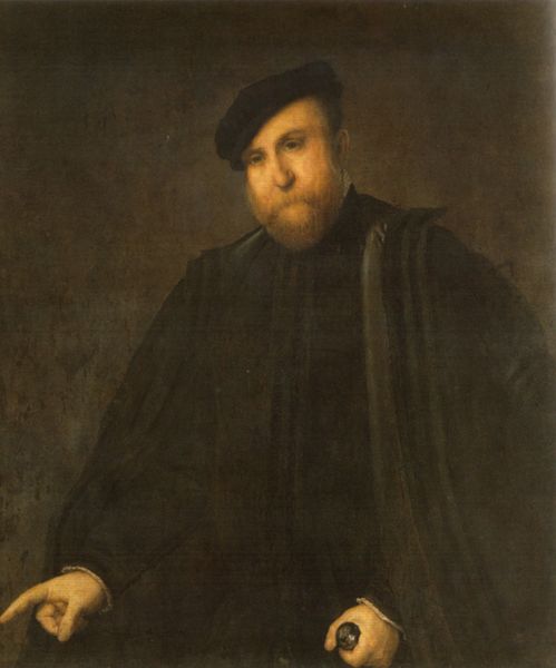 Curator: Here we have Jacopo Pontormo’s “Portrait of Alessandro de’ Medici,” an oil painting created around 1535. It's quite striking, wouldn't you say? Editor: Yes, initially I’m drawn to the subject’s somber gaze. There's an undeniable intensity. But I also notice how Pontormo has rendered the textures of the black fabrics - they’re rich, layered, almost palpable. One might even suggest the density of those fabrics is intended to convey the weight of power. Curator: Good point. I think the sitter’s apparel points to this. He seems to be sitting near an unfinished doorway or threshold. What does that architectural detail suggest to you, from your vantage point? Editor: Well, Alessandro was the Duke of Florence, appointed by Charles V. In his dark garb, he certainly appears like a figure commanding power, despite the somewhat unfinished background, one is reminded of his complex social position as a figure representing multiple forms of patronage, control, and influence. The clothing serves to announce wealth and position. I suppose it works well here; he appears deep in contemplation. Curator: Indeed. It's interesting to consider the social circumstances surrounding its commission. The portrait seems to allude to themes beyond Alessandro’s known identity and position. It makes me consider what meaning it attempts to relay about a leader still facing so much political and social contestation during that moment. Editor: It's hard not to see the visual cues signaling authority – the dark clothing being very obvious, yet its materiality feels so prominent here. Pontormo was surely aware of his patron's position and the social currents of that moment. Do you think this reflects the fraughtness of Medici power at that time? Curator: It seems entirely likely. How compelling that Pontormo has created a likeness of a man who might, through his physical bearing and adornment, signify power but does so against a background lacking full material closure or solidity. Editor: A lasting visual encapsulation of political life. I’m quite interested to see how his personal symbols develop over time in Florence, through its art. Curator: And I am compelled to consider its physical creation, the pigments and canvas selected, its presence in that society during that particular time and its resonances today. It continues to be a worthwhile source of inquiry.