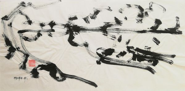 Alfred Freddy Krupa made "The Landscape in a Few Strokes" with ink on paper. It’s all about capturing the essence of a scene, not just copying it, and for me, that’s where the magic happens, it's about the artmaking process. Look at the textures he coaxes from the ink. It’s like he’s wrestling with the medium, pushing it to its limits. The brushstrokes are so direct, so confident, you can almost feel the artist’s hand moving across the paper. Notice that horizon line - thick, bold, a slash of ink that anchors the whole composition. It’s not just a line; it’s a statement. It reminds me of Franz Kline, but with a zen twist. Krupa invites us to see the world with fresh eyes, to find beauty in simplicity, and to appreciate the messy, imperfect nature of art and life itself. It's an ongoing conversation, and Krupa is adding his voice to the mix.