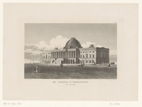 Curator: This engraving, entitled "Gezicht op de Revenue Buildings, te Liverpool," attributed to William Home Lizars, offers a detailed view of the Liverpool Revenue Buildings sometime between 1834 and 1848. It’s a prime example of neoclassicism within urban landscapes. Editor: My initial impression is one of austerity, almost oppressive order. The rigid lines of the architecture contrast sharply with the implied vibrancy of city life. It feels very…official. Curator: And intentionally so, I imagine. Neoclassicism in civic architecture during this period communicated power and stability, referencing the grandeur of ancient Rome. Consider the symbolism embedded in these meticulously rendered columns, the precise symmetry; it's all about projecting an image of unshakeable authority. We must remember the political and social contexts during the Victorian era in England. Editor: Exactly. It’s not merely a building; it’s a statement. What I find particularly striking is the almost complete absence of…messiness. Even the people in the foreground seem carefully placed, contributing to this sense of unwavering control. We can examine it through Foucauldian lenses. The whole design promotes discipline. Curator: That’s an interesting point. The composition certainly invites a reading related to social control. But I’m also struck by how Lizars used the medium of engraving to capture light. The gradations of grey give a sense of depth to the flat print. He must have had very thorough historical understanding of architectural styles and a solid approach towards artistic media to convey his messages successfully. Editor: But the very act of portraying these buildings with such formality underscores their role within a specific power structure, right? By focusing on that monumental, neoclassical style, the artist highlights not just architectural design but also the relationship of ordinary people within those massive power buildings, and he focuses the public role of art at that moment, but still idealizing power. Curator: Yes, there’s no denying the artwork embodies a particular viewpoint, reflective of its time. Exploring it from various critical perspectives, as we've started, lets us uncover the social and ideological forces shaping not just artistic representation but civic identity in burgeoning industrial cities such as Liverpool. Editor: Agreed. It's fascinating how a seemingly straightforward architectural rendering can become a rich tapestry of political and social commentary when viewed through different frameworks. I find it even speaks volumes about urban development. Curator: Precisely. Each approach unearths another layer, proving this piece's enduring relevance in discussions about history, art, and society. Editor: Absolutely, it provokes dialogue not only about the past but about ongoing issues of power and representation.