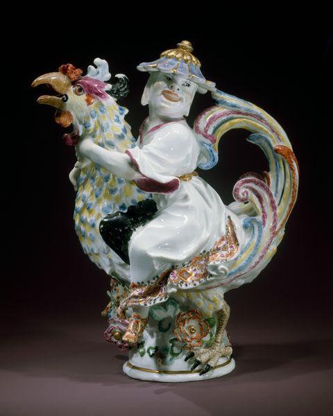 This porcelain oil or vinegar cruet was crafted by the Meissen Porcelain Manufactory. We see a figure riding a rooster, a motif laden with symbolism. The rooster, often associated with vigilance and courage, stretches back to ancient Greece, where it was sacred to Apollo, god of light and knowledge. Consider the figure atop the rooster: this pairing echoes images of triumph, where the hero subdues the animal, symbolizing the mastery of instinct. But the image takes on a new dimension, doesn't it? It is not a god-like figure riding a rooster, but rather a comical, human figure, thus it is more about humor and lightheartedness. Observe how the rooster itself is transformed through the artist’s vision, adorned with delicate colors and decorative details, thereby signaling a celebration of cultural exchange. This cross-cultural transformation speaks to the psychological power of images to adapt, evolve, and resonate across time and space. These images, ingrained in the collective psyche, evoke a sense of continuity and cultural memory.