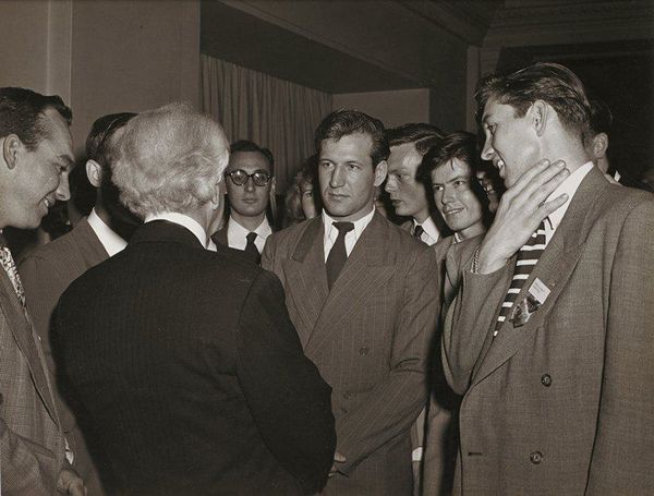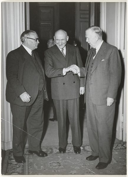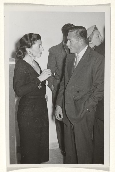 Curator: This gelatin-silver print captures a scene titled "Gideon Elon in gesprek met twee onbekende mannen, tijdens een receptie gedurende de KLM-tijd van Isabel Wachenheimer," dated sometime between 1956 and 1973. Editor: What strikes me is the rather rigid composition. The three figures are almost architectural in their placement, forming these firm vertical lines with their bodies, bisected by their heads. Curator: Indeed, the photograph documents Gideon Elon in conversation during a KLM reception during Isabel Wachenheimer's tenure. It provides a glimpse into the social dynamics of the era, highlighting the interconnectedness of industry, social gatherings, and influential figures within KLM’s circle. It allows for reflection on gender roles at the time, considering Wachenheimer's position within a predominantly male-dominated field. Editor: Absolutely. And what’s interesting from a formal perspective is the play of light and shadow on their faces and attire. Look at the contrast created by the pinstripes on the suit of the man to the right, juxtaposed against the softer, almost muted tones of Elon’s jacket. It almost visualizes an unequal balance of power. The lighting creates a certain starkness, emphasizing their expressions and, frankly, the tension in the scene. Curator: It's fascinating how this seemingly simple photograph opens up inquiries into mid-century power dynamics, and institutional history through KLM. The event location is so undefined and nonspecific that the figures almost seem frozen in the past. Editor: Exactly. Even the medium—gelatin silver—contributes to that sense of historical distance. But the grayscale tones also allow us to concentrate on form and structure in its purest essence: what lies beyond time itself. It reduces narrative excess in a beautiful reductionist form. Curator: It's images like this that demonstrate the profound power of photographs as a documentary form, not only for the elite, but as windows into socio-cultural life. Editor: Yes, it really boils down to that inherent tension between content and its presentation that renders images of profound impact, across time and social change.