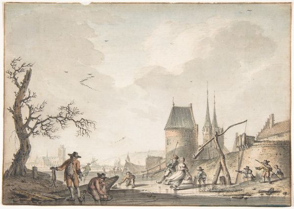 Curator: Looking at this, I feel immediately transported. It’s almost dreamlike—this watercolor by Hendrik Meijer called "Watermolen en dorpskerk," created way back in 1777. Doesn’t it just evoke a kind of pastoral serenity? Editor: Indeed, the tonal values establish precisely that atmosphere. Meijer masterfully distributes light, drawing the eye through distinct foreground, middle ground, and background elements. Notice how the structure leads us from the watermill towards the distant church spire. Curator: And the watermill itself is such a vibrant hub. Life bursts forth with figures milling around, pigs trotting past—a scene teeming with little vignettes. It makes you wonder about their stories, the daily rhythm of that time. There is a theatrical effect that makes the everyday majestic. Editor: Precisely! It demonstrates sophisticated construction with distinct architectural motifs. The strategic placement of the church serves not only as a visual anchor, offering a semiotic gesture—the eternal contrasting to the fleeting moment captured here in the activities of the locals. Curator: I suppose so. It’s less the geometry and more the sensation for me, if you catch my drift. See that little cascade beside the mill? And how it melts into those greens. I nearly sense the cool mist, listen to the grindstone at work; there is an invisible theater for your thoughts. You start thinking of your hometown and old feelings. Editor: The brushstrokes and restrained palette achieve precisely that affect, I see it myself now. It presents an idyllic image, which offers, perhaps, less realism and more constructed interpretation. The watercolor itself, the blending and shading techniques. A very delicate handling, the work speaks volumes. Curator: Totally. It’s an artifact to be sure, but also a little echo from way back, of someone catching that fleeting human stuff—just as valid as anything else he may have achieved! Editor: Indeed, by decoding the image in terms of composition, semiotics, and materiality we have achieved deeper appreciation and enriched understanding of its profound artistic statement.