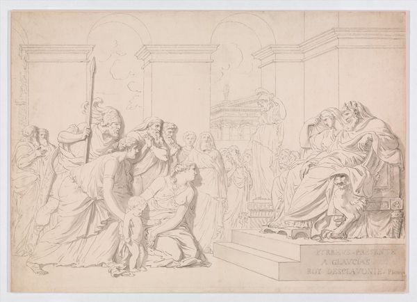 Lorenz Frølich created this pen and ink drawing, Erik Menveds løfte, at an unknown date. The composition is dominated by a contrast between the static figures on the left and the dynamic movement on the right. Linear precision and subtle shading evoke a sense of depth and texture. The figures are arranged in a clear hierarchy, with King Erik elevated on a platform and a mounted knight leading the charge. We can see a clear division between the realm of governance and the field of action. The knight's raised hand, a mirror of the King's gesture, creates a visual echo that links leadership with military endeavor. Frølich uses the semiotic language of heroism, with symbols such as the crown, sword, and charging horse. The drawing invites us to consider how power is represented through both symbolic and structural means, challenging the viewer to interpret the relationship between authority and action.