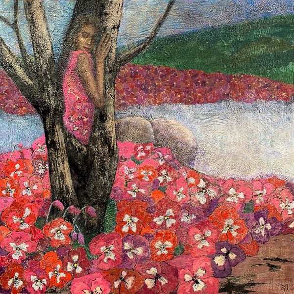 Editor: This is Gustav Klimt's "Italian Horticultural Landscape," painted in 1913. It’s oil paint on canvas, and it feels…lush, almost overwhelmingly so. What do you see in this piece, in terms of the image itself? Curator: Klimt presents the garden not merely as a physical space but as a potent symbol. He seems to compress space, abstracting elements and denying us clear perspective lines. Are you reminded of tapestries, the weaving together of experiences, memories, dreams? Editor: I do see that weaving effect now that you mention tapestries. The image definitely feels compressed, almost flattened. What's the symbolic importance of this effect, and maybe even, the specific choice of flowers? Curator: Think of the garden as a mirror reflecting something about ourselves. A place where nature is both cultivated and wild. A place that can heal. Consider also that, across cultures, flowers have long been potent symbols – roses linked to love, passion, and sometimes even mortality. What memories, what associations, do these blooms evoke for you? Editor: Well, personally, roses remind me of my grandmother's garden. I never thought of it as something… psychological, I guess. I considered them pretty, and colorful, but never loaded with meaning. Curator: Precisely. Klimt taps into this reservoir of collective and personal memories. His impasto technique – the thick application of paint – further intensifies the sensory experience, almost inviting you to touch, to feel the weight of these symbolic forms. He invites us into not only his memory, but the viewers personal memory as well. Editor: That's really changed my perspective. Seeing the cultural symbols really deepened my appreciation for this painting. Curator: Indeed, viewing it as a portal into our own deeply felt impressions adds another layer. Each brushstroke echoes within.