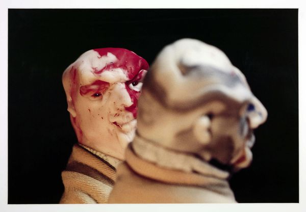 Curator: This photographic print by Thomas Schütte, currently held in the Tate Collections, depicts two rather imposing figures. Honestly, they look like they're plotting something nefarious. Editor: I'm struck by the materiality. Are those figures wearing terrycloth robes? The texture jumps out. It's oddly domestic, juxtaposed with those... grotesque faces. Curator: Grotesque is one word for it! I see a meditation on the masks we wear, the personas we project. Schütte often explored the darker sides of human nature. Editor: I wonder about the making of these masks. What materials? How were they formed? Were they mass-produced or individually crafted, questioning the commodification of identity itself? Curator: Perhaps the ambiguity is the point. Are we looking at rulers, villains, or just ordinary folks hiding behind a façade? It's unnerving, isn't it? Editor: It is. The labor involved in the textile production, contrasted with the unsettling visages, certainly provides a lot to consider. Curator: Indeed. A fascinating glimpse into the theatre of the self. Editor: And the socio-economic structures that inform our perceptions. Thank you.