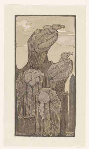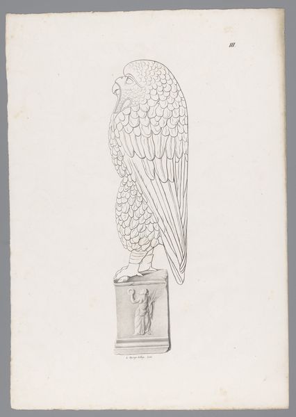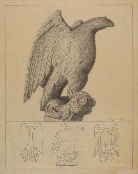 Editor: So, this is "Figurehead: Eagle," a pencil drawing from around 1937. What strikes me immediately is the intense level of detail given the limitations of the medium, almost trompe-l'oeil. What do you see in it, focusing perhaps on the technique? Curator: Well, immediately the relationship between line and form presents itself. The stark realism achieved through line work indicates an emphasis on the subject's materiality and presence, inviting an analysis of semiotics of realism. Consider the composition - a solitary object on a two-tone background. What do you think this draws our attention to? Editor: I guess it forces you to focus on the shape and texture of the figurehead, absent of a surrounding environment. The precision of the lines gives the form substance and tangibility. Curator: Precisely. The absence of color and complex context allows for a study of form itself. Notice the careful shading that gives volume and the sharp outlines that define its edge. How would you describe the use of light? Editor: The light source appears to be coming from above and to the left. The drawing relies on a subtle play of light and shadow to emphasize the three-dimensional form, which almost jumps out at you from the neutral background. It’s very effective! Curator: Indeed, it’s a remarkable example of what can be achieved through considered application of line, shade, and form in drawing, irrespective of overt historical symbolism. Editor: I learned how paying close attention to the lines, shadows, and the isolation of the figure can drastically affect how we perceive an artwork. It definitely makes you see the drawing and subject in a whole new light. Curator: Likewise, observing your fresh perspective is invaluable, a clear indication of how structural analysis helps one deconstruct the visual language and amplify appreciation.