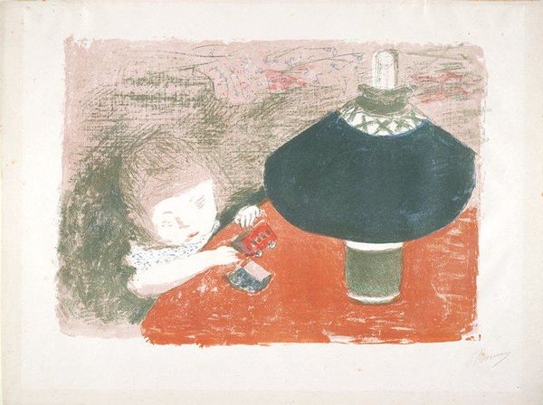 Editor: This woodblock print, "Reclining Beauty" by Hide Kawanishi, features a woman in a bird-patterned kimono. I'm struck by the contrast between the flat planes of color and the intricate details. What do you make of it? Curator: The woodblock technique itself is key. Consider the labor involved in carving each block for each color, and the socio-economic context of producing art for wider consumption versus the elite art world. How does this impact our view of ‘high art’? Editor: So, the material and the way it was made are significant? Curator: Absolutely. The materiality pushes us to examine the processes of production and challenges traditional boundaries between art and craft. It makes you wonder about the role of the artist. What is he saying about art's status? Editor: I see. It's not just an image; it's about the work that goes into it. Curator: Exactly.