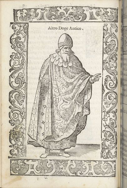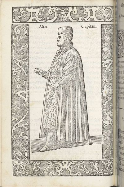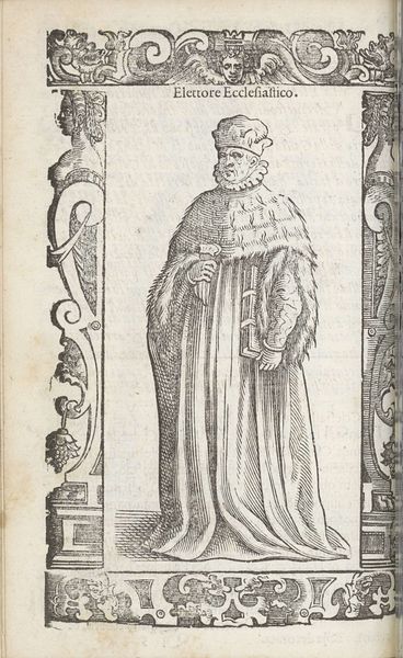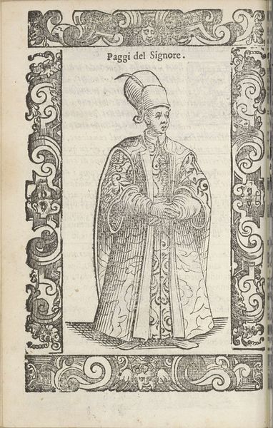 Curator: This pen and ink drawing, created around 1598 by Christoph Krieger, is entitled “Giovane Nobile.” Editor: The intricacy of the linework immediately strikes me, and its clear purpose: the visual encoding of status. Look at how those finely wrought lines describe the fabric's fall and gather. The engraver wants to convey the cost and weight of this noble's attire. Curator: Indeed, this portrait of a young nobleman exists as part of a broader visual rhetoric of status and power during the late 16th century. What’s fascinating to consider is how dress was deliberately used to communicate a visual language. The seemingly voluminous clothing, the cap, all coalesce to project a certain kind of persona steeped in privilege and power. It's about performing nobility. Editor: Performance is the key. Note the deliberate asymmetry—the pose, the fall of light creating contrasting forms. It's carefully stage-managed, and the artist utilizes the ornamentation around the image itself to reinforce a sense of theatricality. Curator: And beyond this singular portrayal, engravings like this served a vital purpose within the context of burgeoning print culture. They became instrumental tools to disseminate images across vast distances. By circulating portrayals of those in positions of power, these prints molded collective perception and solidified social structures. The relatively young noble benefits from, and contributes to, the entrenchment of power relations. Editor: What’s especially interesting is the constraint the engraver operated under. The reduction of tonal range emphasizes the deliberate nature of mark-making, highlighting the structural framework, the figure emerging through controlled lines. Curator: Seeing this drawing offers a reminder that what we deem beautiful can sometimes hold within it the reflection of societal hierarchies and deeply ingrained power structures. Editor: The real genius lies, then, in extracting aesthetic qualities from these symbolic constraints, wouldn’t you say?