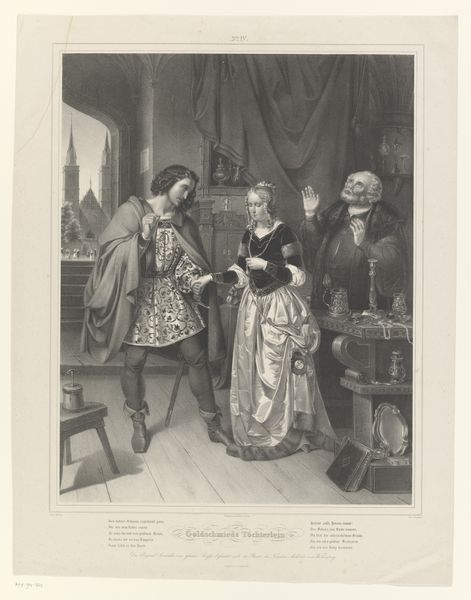 Ernst Friedrich Oldermann made this print of a man viewing merchandise at a goldsmith’s, although the exact date is unknown. The image captures a moment of commerce and display, reflecting the economic and social values of the time. Made in Germany, the print is a window into the 19th-century world, particularly the rise of the middle class and their engagement with luxury goods. We can see the elaborate dress of the customer, the detailed interior of the shop, and the careful arrangement of the merchandise which all point to a culture that valued craftsmanship, trade, and the visual representation of wealth. Perhaps Oldermann is commenting on the emerging culture of consumerism and the social dynamics between merchants and their clientele. To gain a deeper understanding, we might explore 19th-century German trade practices, sumptuary laws, or the role of artisans in the burgeoning industrial economy. Art is always embedded in its historical context and the job of the art historian is to unpack those layers of meaning.