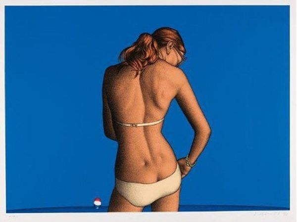 This work by John Kacere presents us with a hyperrealistic, close-up view of a woman's midsection, partially covered by delicate blue fabric. The focus is drawn to the blue panties, trimmed with lace, an intimate garment presented as a central motif. Consider how veils and draped fabrics have been employed throughout art history to both reveal and conceal, evoking mystery and allure. From ancient sculptures of veiled goddesses to Renaissance paintings, the act of covering and uncovering holds profound symbolic weight. Lace, with its intricate patterns, echoes the complex web of human desire and the artifice of attraction. These elements tap into a collective memory, stirring deep, subconscious associations with sensuality and vulnerability. The intense realism and cropping create a powerful psychological effect, inviting the viewer into an intimate, almost voyeuristic space. The image resonates with the cyclical nature of desire and representation, continually resurfacing and evolving in our collective consciousness.