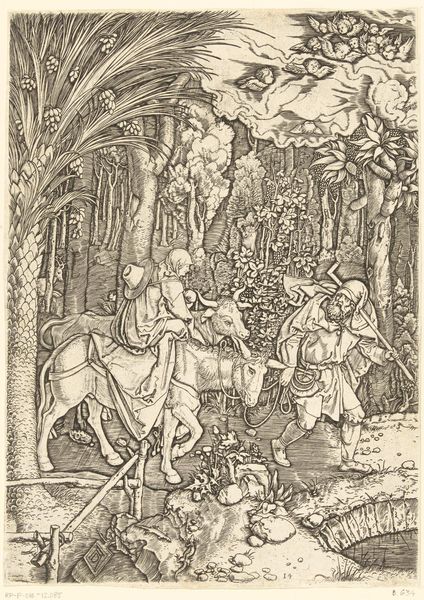 Editor: This is Albrecht Dürer's "The Flight into Egypt," from 1511. It's an ink woodcut. The detail is incredible! What strikes me most is how he's captured the texture of the forest. What do you see in this piece, from a formalist perspective? Curator: I am drawn to the stark contrast between light and shadow, a hallmark of Dürer's woodcut technique. Observe how this contrast is employed to create depth and volume. Note the masterful use of line – varying in thickness and density – to delineate form and texture, from the dense foliage to the delicate rendering of the figures’ drapery. Editor: So, the contrast and line work are key to understanding the piece's composition? Curator: Precisely. The composition is not merely representational; it is a calculated arrangement of formal elements. Consider the dynamic interplay between the horizontal lines of the landscape and the verticality of the trees. How does this interplay affect your perception of the scene? Editor: I see how the verticals and horizontals create a sense of both movement and stability. The eye is led through the image but also anchored by those strong lines. Curator: Exactly! And how does the artist handle the organization of forms in relation to the picture plane? Note the balance of positive and negative space, the rhythmic repetition of shapes and patterns, and the overall unity and coherence of the design. Editor: It’s interesting to consider those elements. Thanks, I'm definitely looking at it with a different perspective now. Curator: Indeed. Approaching the artwork from this perspective makes one appreciate the thoughtful balance between form and space, leading to a better interpretation.